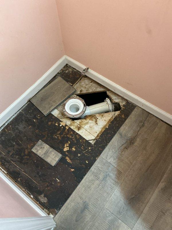 Completed toilet flange and bend replacement as previously sold. Upon arrival, found the subfloor had been removed as requested, revealing significant water damage and discoloration around the drain area. Installed new PVC p-trap assembly and properly secured the plumbing components to ensure proper drainage and prevent future leaks.