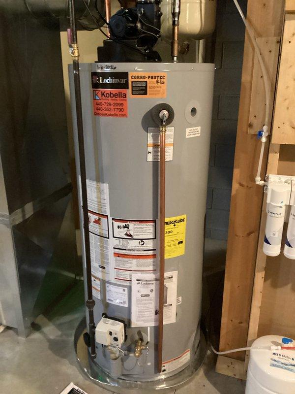 Completed annual plumbing membership service visit with successful installation of new water heater. Unit properly mounted with copper piping connections and verified operational. Existing water filtration system remains in place adjacent to the new installation.