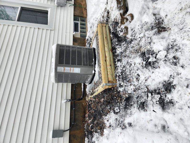 Inspected outdoor HVAC unit where gravel was washing out from under the pad down the slope. Installed wooden frame structure around the unit's base to contain gravel and prevent further erosion. Documented installation with photos showing the completed erosion control solution.