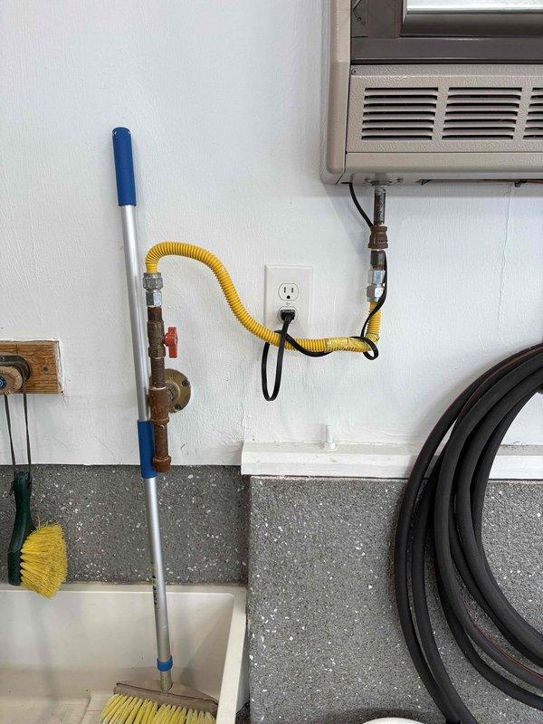 Inspected wall-mounted gas heater in garage. Unit is properly installed with required electrical connections and appears to be functioning correctly. Gas line and shut-off valve are in good working condition.