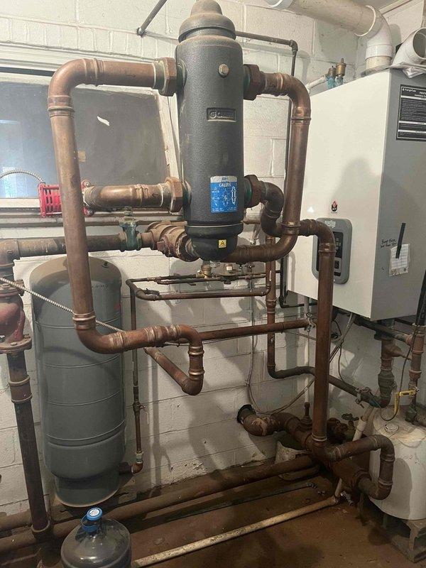 Conducted site inspection at NurseryTech to evaluate existing boiler system requiring repair. Documented significant pipe deterioration and corrosion, with measurements taken of clearance gaps between ceiling and damaged copper piping. Assessed mechanical room containing aging circulation pumps and associated plumbing infrastructure. Prepared comprehensive estimate for boiler repair options and additional quote requested for garage bay area heater installation.