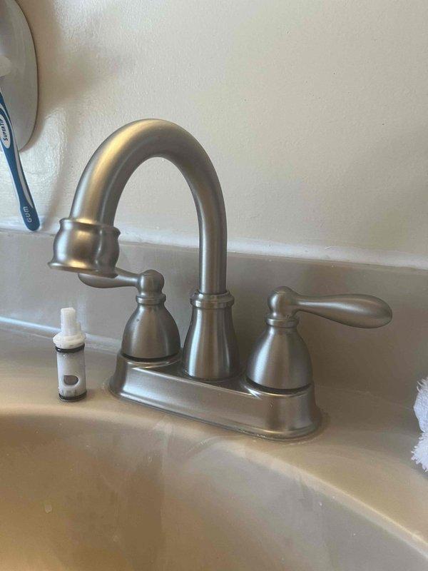 Diagnosed and serviced leaking 4" center set Moen bathroom faucet. Inspected brushed nickel/stainless steel fixture with lever handle on right side and rounded knob on left side. Completed necessary repairs to resolve the leak issue.