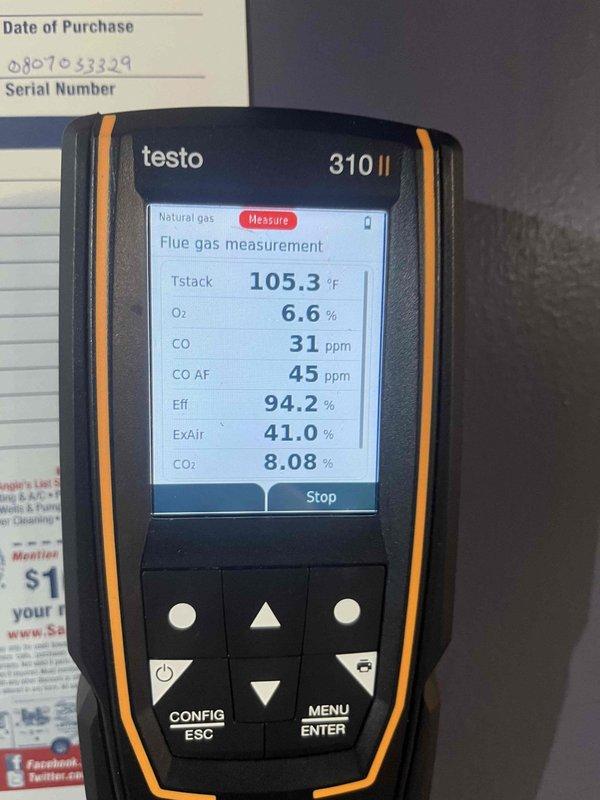 Responded to no heat complaint where furnace was blowing cold air. Diagnostic testing with Testo 310 II analyzer showed combustion readings within acceptable parameters (O₂: 6.6%, CO: 31 ppm, CO₂: 8.08%, efficiency: 94.2%) but stack temperature was low at 105.3°F. Restored proper heating operation after adjusting gas pressure and cleaning flame sensor to ensure reliable ignition.