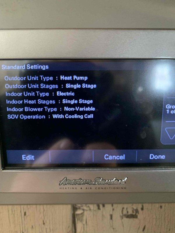 Inspected newly installed heat pump system and identified need for auxiliary heat temperature adjustment. Verified thermostat settings on American Standard control panel confirming proper configuration (Heat Pump/Single Stage/Electric/Single Stage/Non-Variable Blower/SOV with Cooling Call). Documented current settings for follow-up adjustment by Mike T and Justin.